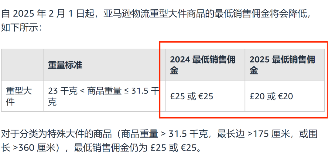亞馬遜物流配送的重型大件商品最低銷售傭金從25英鎊/25歐元降到20英鎊/20歐元。